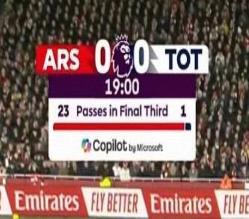 在本场比赛进行了19分钟之后,转播信号提供了对阵双方在进攻三区内的传球次数数据,其中阿森纳在进攻三区内有23次传球,而托特纳姆热刺则只有1次。